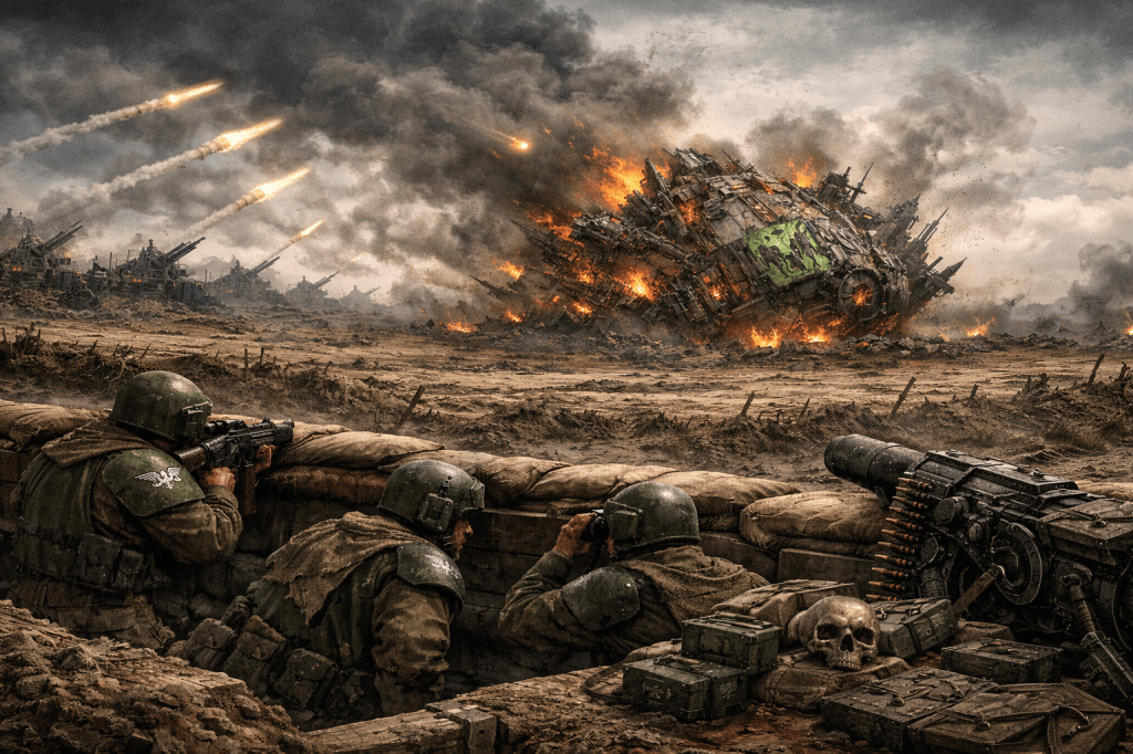 Rumours have been going round that tonight’s the night. That the order will finally be given. That we will go over the top and take the fight to the Orks, pushing them back towards their meteor and their final defeat. It’s been so long since we dug the lines, it’s hard to remember the last time we fought them head on. We all remember it though, the horde ripping apart those guardsmen unlucky enough to close the gap. No one expects to survive again.